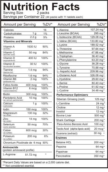 Animal Pak ile ihtiyacınız olan herşeyden yeterince alırsınız. Hem de bir kaç ekstra ile birlikte! Pak performansınızı en optimum seviyeye çıkarmaya yarayan pyridoxine alpha-ketoglutarate (PAK), karnitin, lipotropikler, L-arjinin,alpha lipoik asit, eleuthero ve benzeri daha birçok maddeyi içerir. Her bir pak ile 60’ın üzerinde temel gerekli içerikleri doğru zamanda ve en doğru miktarda alırsınız. Bir pak içerisindeki 11 tablet bunun için özel olarak formülize edilmiştir.