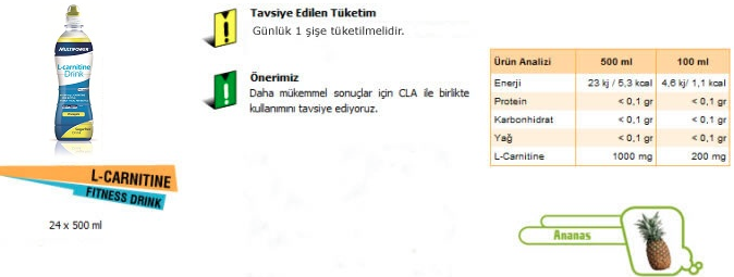 500 ml’ lik şişe içinde 1000 mg L-Carnitine oranı ile hem antremanlarda kaybedilen sıvının belli bir kısmını karşılamaktadır hemde yüksek L-Carnitine miktarı ile yakılacak yağ miktarını artırmaktadır.  Ayrıca yağ moleküllerinden gelen fazla enerği kazanımı için önce yağların yanmasını sağlar ve böylece önemli glikojen depolarının korunmasına yardımcı olur. Bu sebepten dolayı L-Carnitine, dayanıklılık gerektiren antremanlarda kas yorgunluğunu geciktirir ve dolayısıyla fiziksel performansınızı doğal olarak artırır. Antreman sırasında kullanılmayan glikojen depoları sayesinde ise antreman sonrası kendinizi daha iyi hissedersiniz ve bir başka sosyal aktivite ile keyifli saatler geçirebilirsiniz.